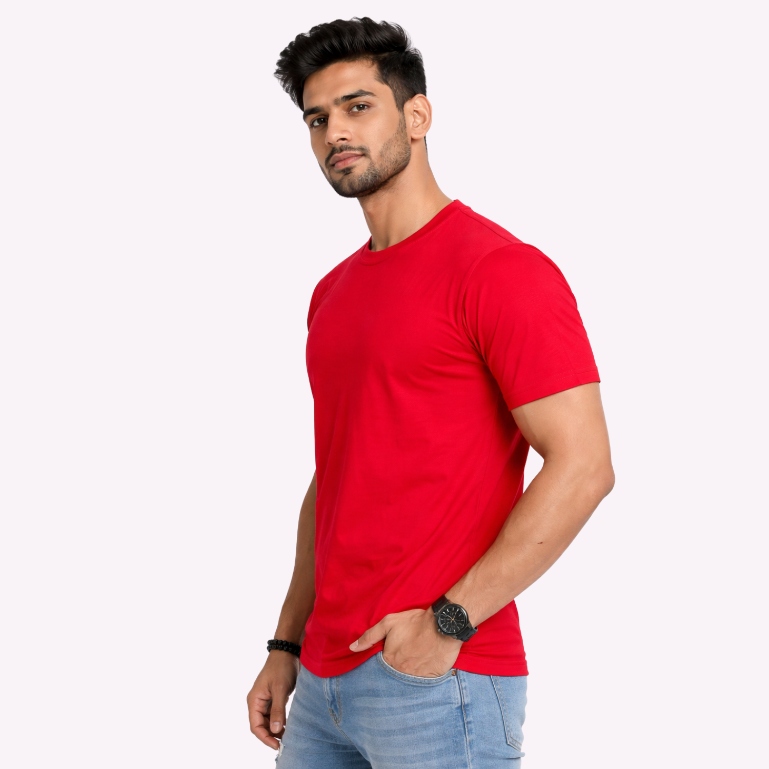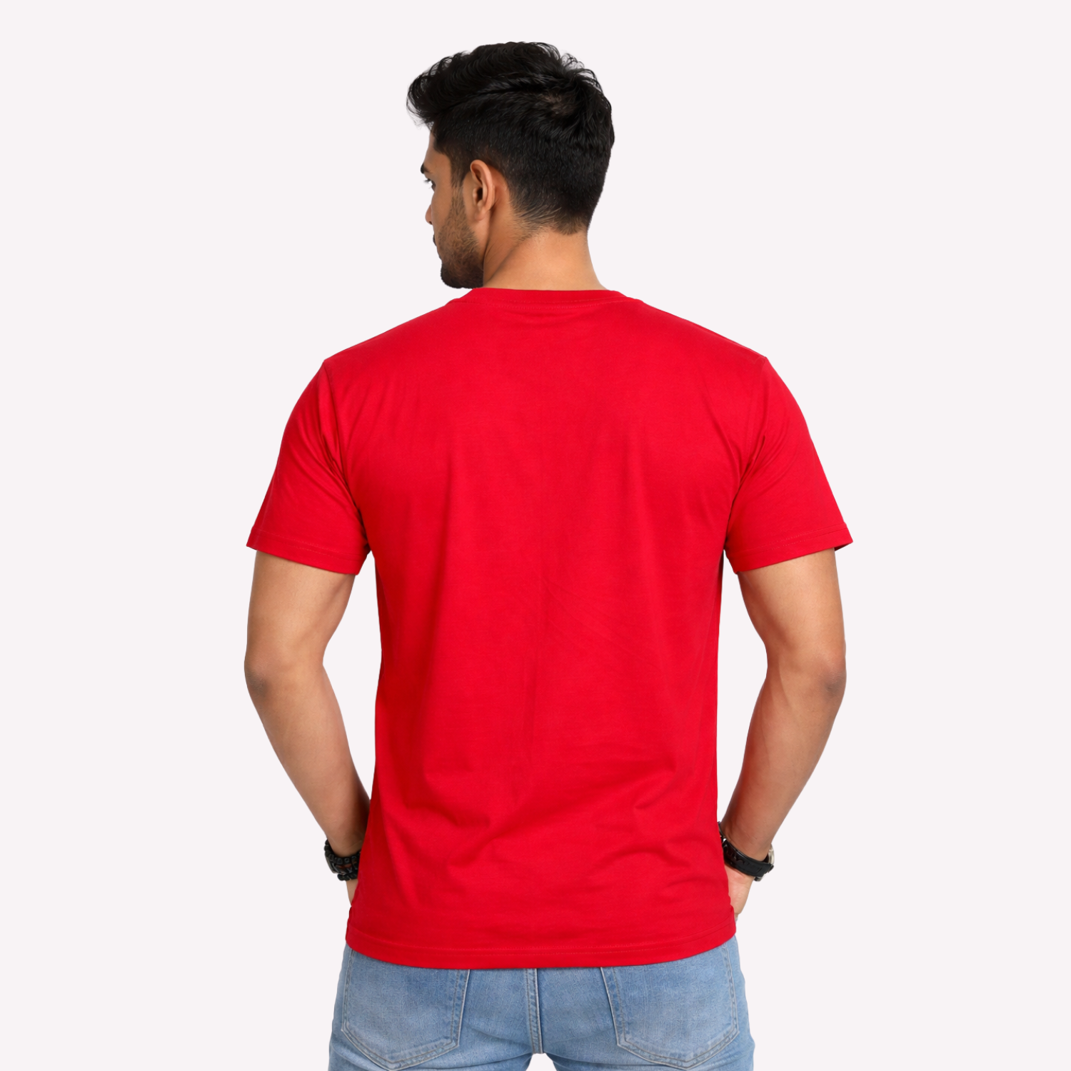 The bold solid red shade adds confidence to your look without being overwhelming. Its classic round neck and half-sleeve design offer a timeless silhouette that pairs effortlessly with jeans, joggers, or shorts. Whether you’re stepping out for a casual outing, heading to college, traveling, or relaxing at home, this versatile piece adapts to multiple settings with ease.