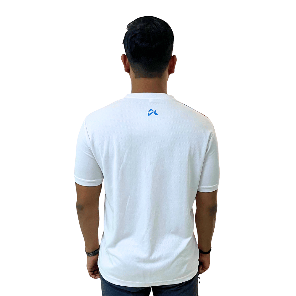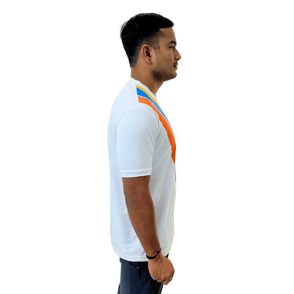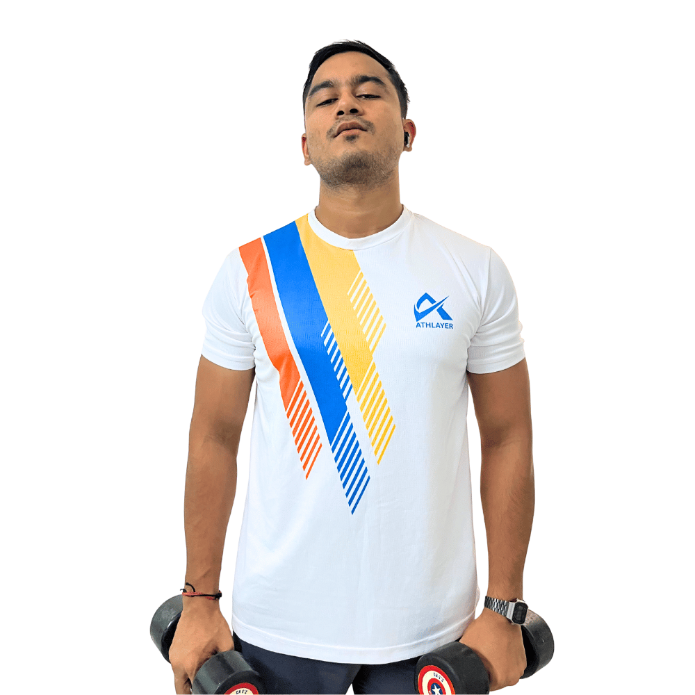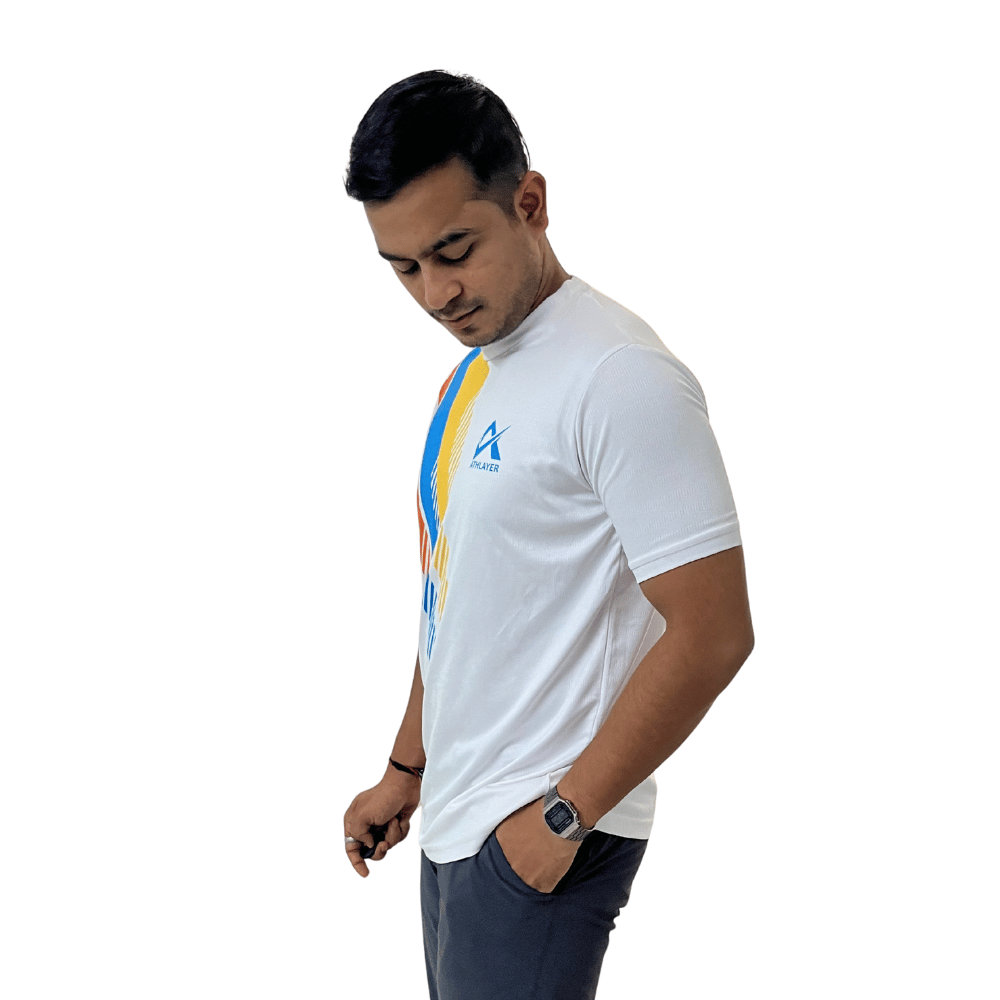 The white t-shirt for men features a round neck and a bold diagonal multicolor streak sublimation (red, yellow, and blue) that gives a sporty, energetic vibe. Whether you’re at the gym, out for a run, or keeping it casual, the polyester t-shirt for men ensures quick-dry comfort, 4-way stretch flexibility, and high breathability to keep you cool and confident all day.